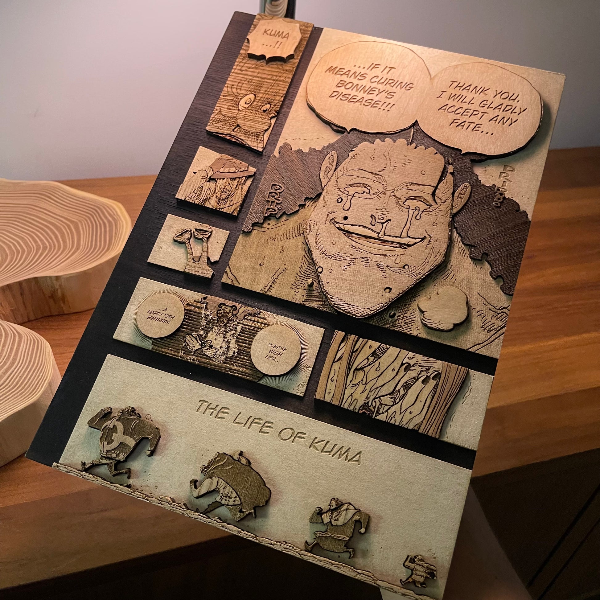 Cette technique permet de créer du relief en utilisant plusieurs strates de bois massif. Une combinaison soignée de ces dernières met en valeur les scènes cultes de l’univers du manga.
