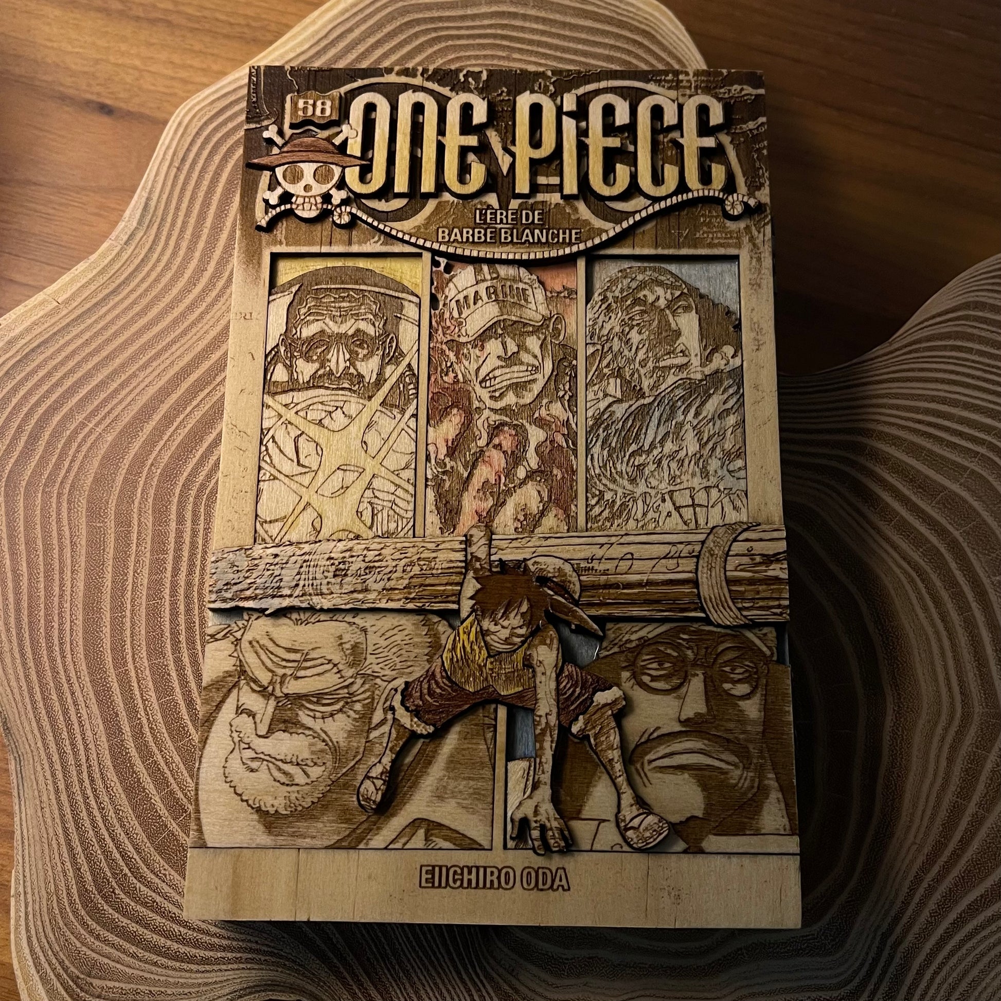 Cette technique permet de créer du relief en utilisant plusieurs strates de bois massif. Une combinaison soignée de ces dernières met en valeur les scènes cultes de l’univers du manga.